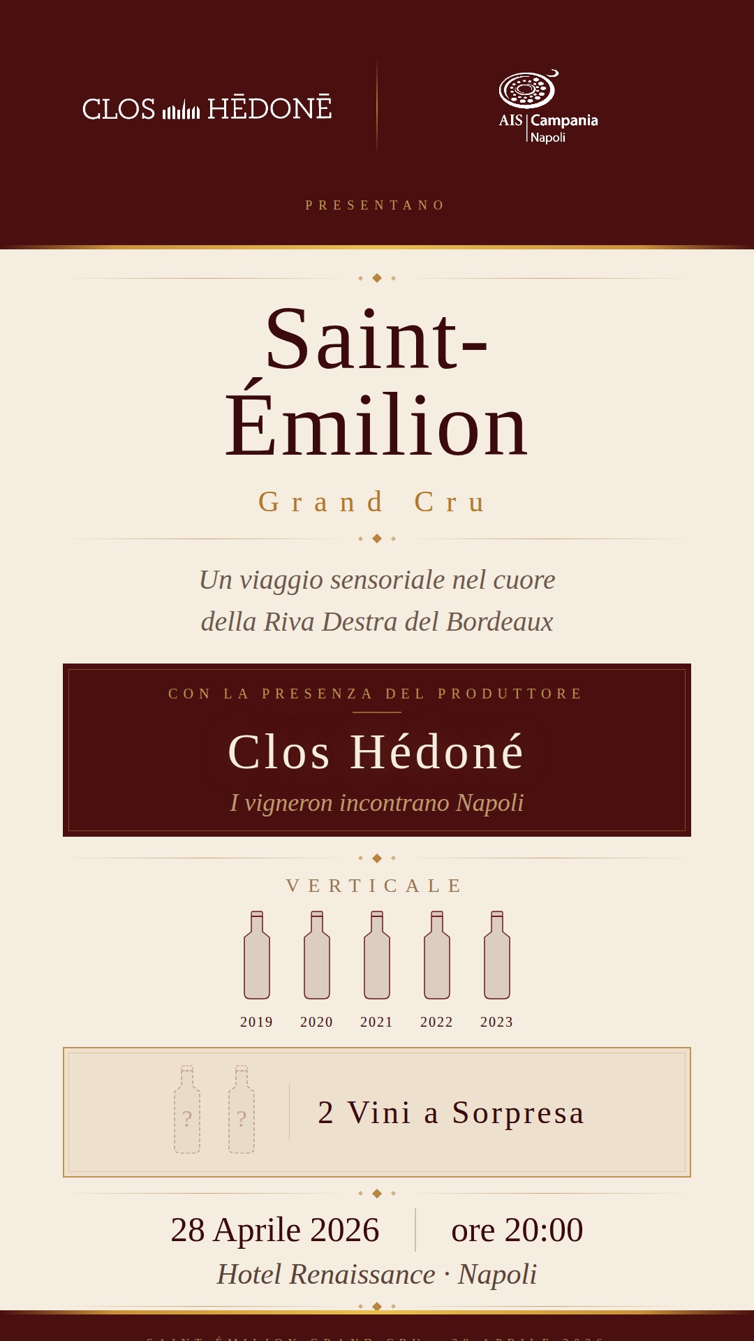 Clos Hédoné e AIS Napoli ti invitano a un viaggio nel cuore della Riva Destra del Bordeaux, terra di mitici vini rossi.