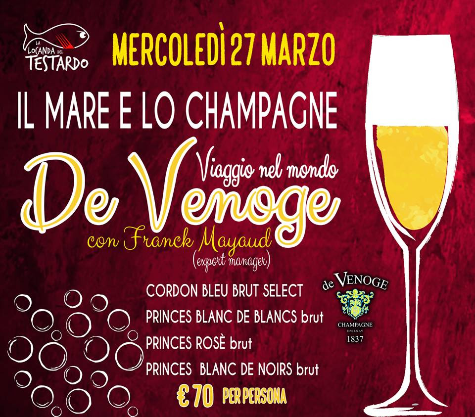 Viaggio nel mondo dell’antica maison De Venoge con la partecipazione di Franck Mayaud, export manager della casa francese. I sapori del mare caratteristici della Locanda del Testardo si sposano con le varie produzioni della prestigiosa azienda vinicola di Ėpernay.