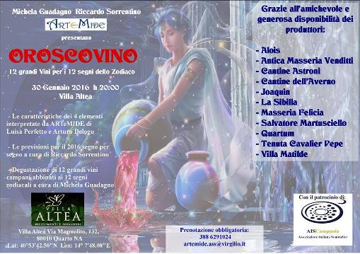 Le caratteristiche dei 4 elementi acqua-aria-fuoco-terra verranno interpretate da ARTeMIDE con divertenti interventi teatrali di Luisa Perfetto e Arturo Delogu. Le previsioni per il 2016 segno per segno sono elaborate dall’astrologo Riccardo Sorrentino. Gli abbinamenti di 12 grandi vini campani ai 12 segni zodiacali sono proposti da Michela Guadagno consigliere regionale Ais Campania e la degustazione è a cura di Nicoletta Gargiulo Presidente Ais Campania.